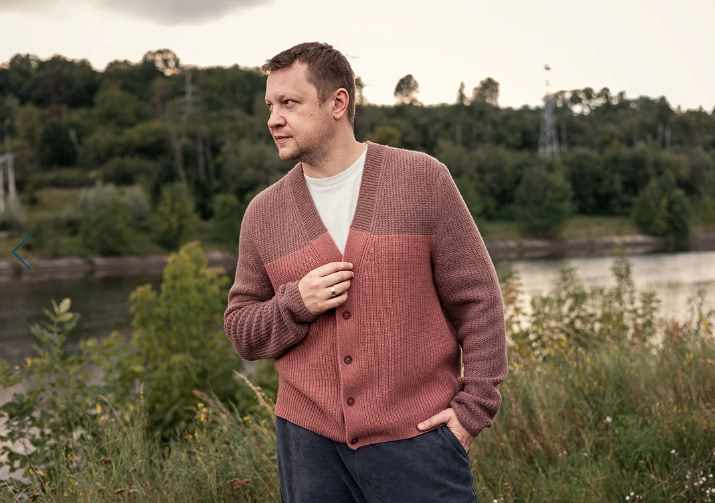 Кардиган с V-вырезом умеренного/увеличенного объема, прямого силуэта, вяжется жемчужной и структурной резинкой снизу вверх отдельными деталями. Декоративный элемент - планки (вертикальная и горизонтальная), стыкуются сверху на полочках и создают центр притяжения всей конструкции. Кардиган может быть как мужским, так и женским.